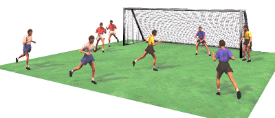 Groups of partners play "tag" in the penalty area. One partner starts as "it" and must chase his partner in the penalty area until he can tap him on the shoulder to trade roles. Neither partner wants to be "it" when time is called (after 1 or 2 minutes), because whoever is "it" must do five hops. The players being chased can "hide" behind players in other pairs. Play three games of 1 to 2 minutes each.