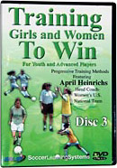 For youth and advanced players - Progressive training methodsFeaturing April Heinrichs, Former Head Coach - Women's US National teamIn the world of women's soccer, no one can match the combined experience of April Heinrichs as a player and coach. 'Training Girls and Women to Win' is a 3-part series in which girls and women soccer players and coaches, under the direction of Coach Heinrichs, demonstrate a series of skills and drills for both youth and advanced players. Each DVD includes sections on the technical, tactical, physical, and psycological aspects of soccer, as well as exciting Women's World Cup footage featuring the top U.S. women players in action. 73 minutes.Disc 3Technical-Youth Shooting-Advanced ShootingTactical-Youth 2v2 Attacking-Advanced 2v2 Attacking-Youth 3v3 Attacking-Advanced 3v3 Attacking-Youth 2v2 Defending-Advanced 2v2 Defending-Youth 3v3 Defending-Advanced 3v3 DefendingPhysical-Strength training & personal healthPsychological-Affirmations This video is available in DVD format only.